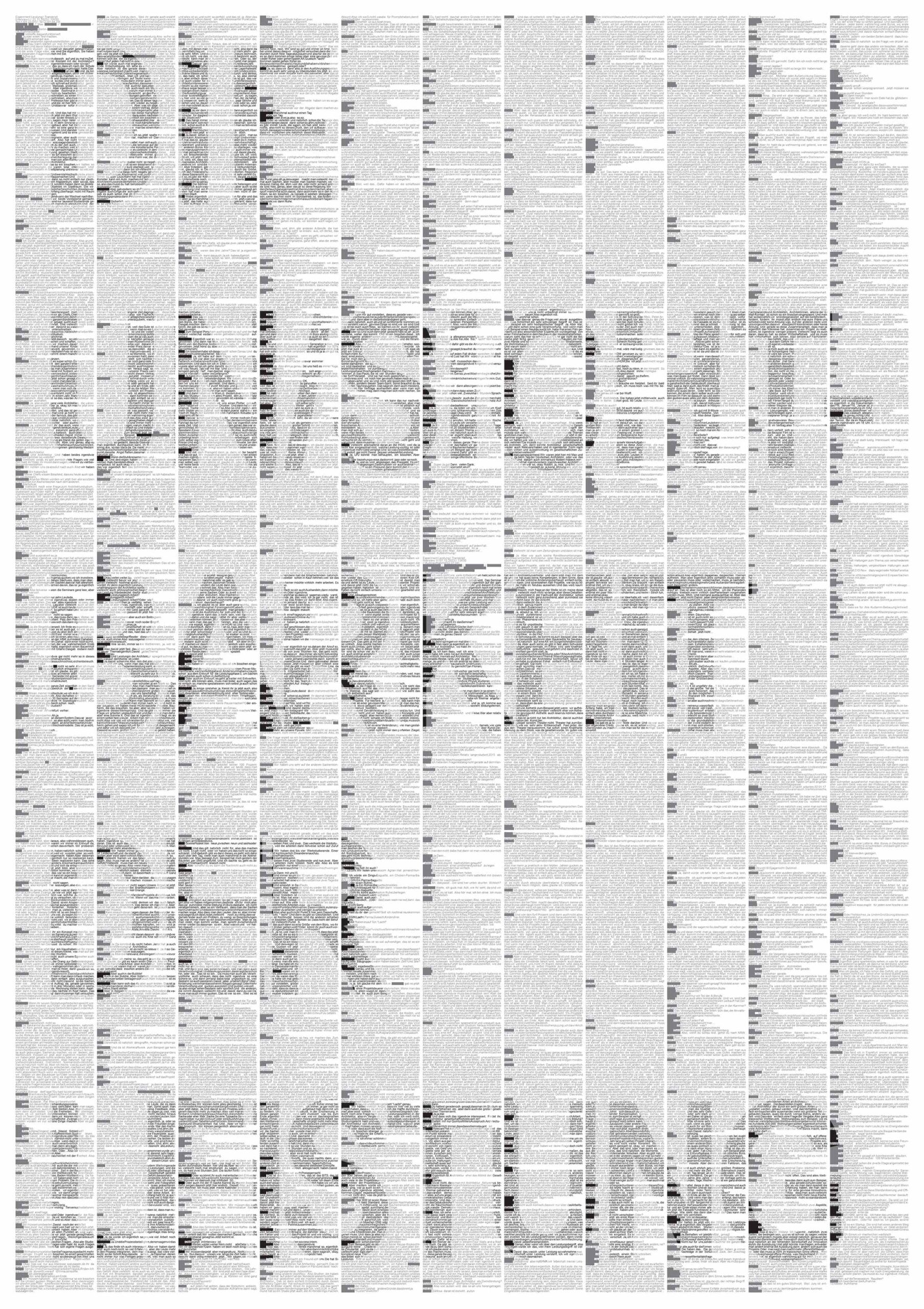 Die Un/Sichtbarkeit der Leistung stellte sich dabei als immer wiederkehrendes Thema heraus und inspirierte das Plakat, welches das gesamte Transkript der ca. 6 Stunden Interviews zeigt. Dabei soll die Arbeit und der Prozess aufgezeigt werden, welche oft unsichtbar im Hintergrund geleistet werden wobei nur das Endprodukt sichtbar bleibt – Ein Sinnbild der öffentlichen Wahrnehmung von Architektur und Architekturarbeit in Deutschland.