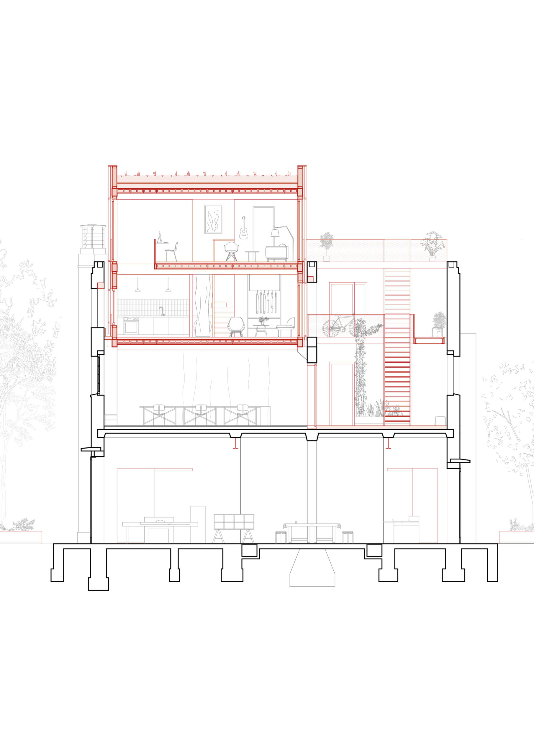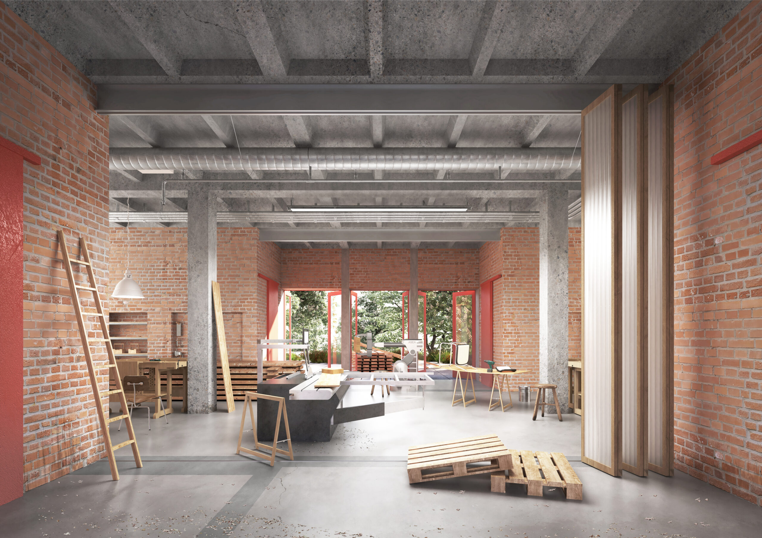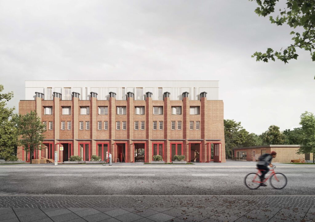 Im Erdgeschoss und im 1. OG befindet sich nun die Werkstatt, darüber setzt sich der neue Baukörper mit zwei Wohngeschossen. Da dieser sich nicht über die gesamte Tiefe des Gebäudes erstreckt, ergibt sich ein neuer Aufenthaltsraum im Außenbereich, der gleichzeitig über Treppen und Stege der Erschließung der Wohnungen dien. Im Erdgeschoss wird die bestehende Zellenstruktur teilweise aufgebrochen. So entstehen zwei neue Hallen für den analogen und digitalen Werkstattbereich, welche die zentrale Bestandshalle kreuzen, in der sich die Werkbänke befinden.