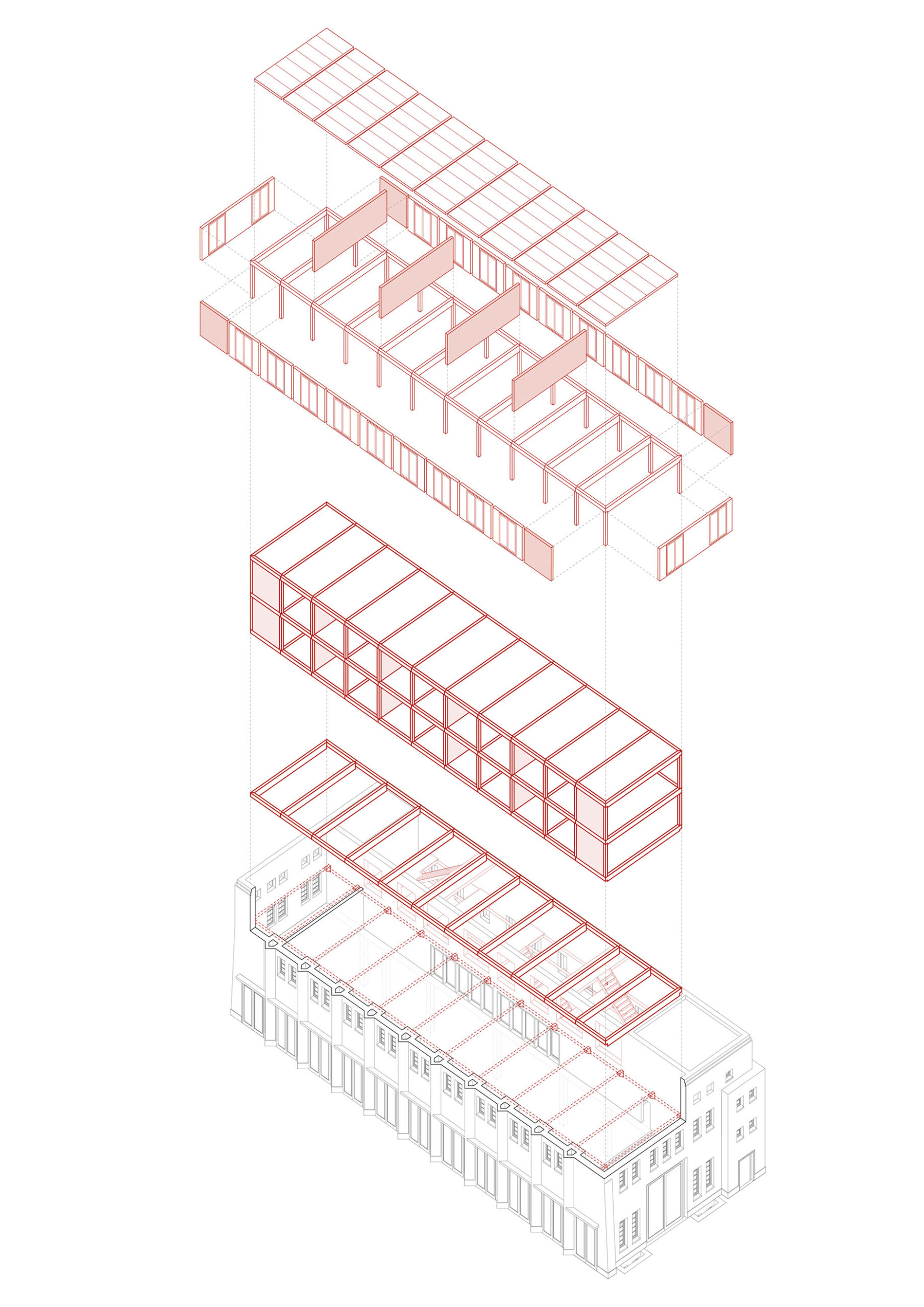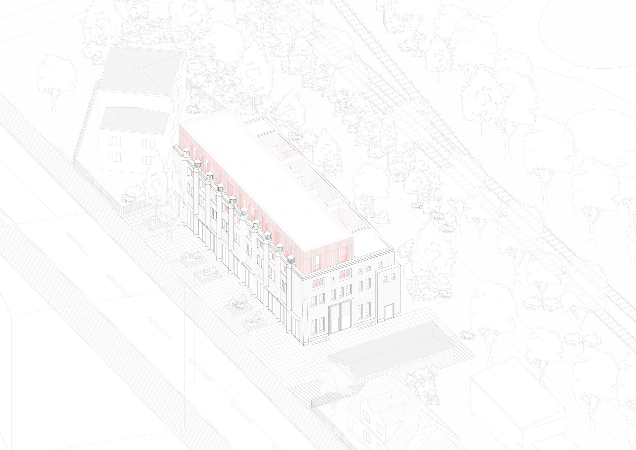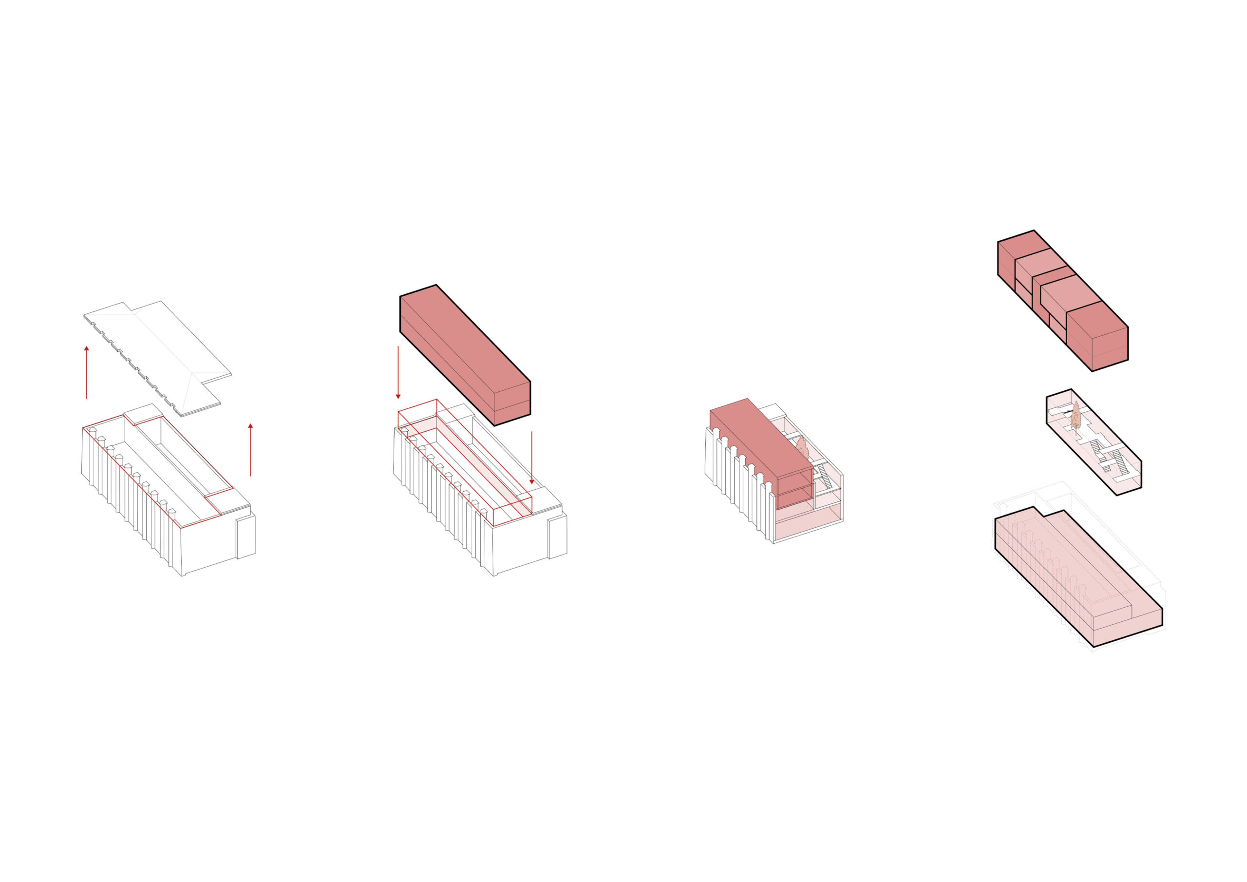 Der Bestand gliedert sich in zwei Geschosse. Das Erdgeschoss ist geprägt durch kleine Zellenstrukturen entlang der Längsfassaden und einer zentralen großen Halle. Das Obergeschoss, besteht aus zwei längs angeordneten Hallen. Ein leichter neuer Baukörper wird im Obergeschoss eingesetzt, welcher über zwei Geschosse Wohnungen in verschiedensten Konfigurationen anbietet. Hierfür werden die bestehenden Konsolen eines Ehemaligen Schwerlastkrans als Auflagerpunkte genutzt.