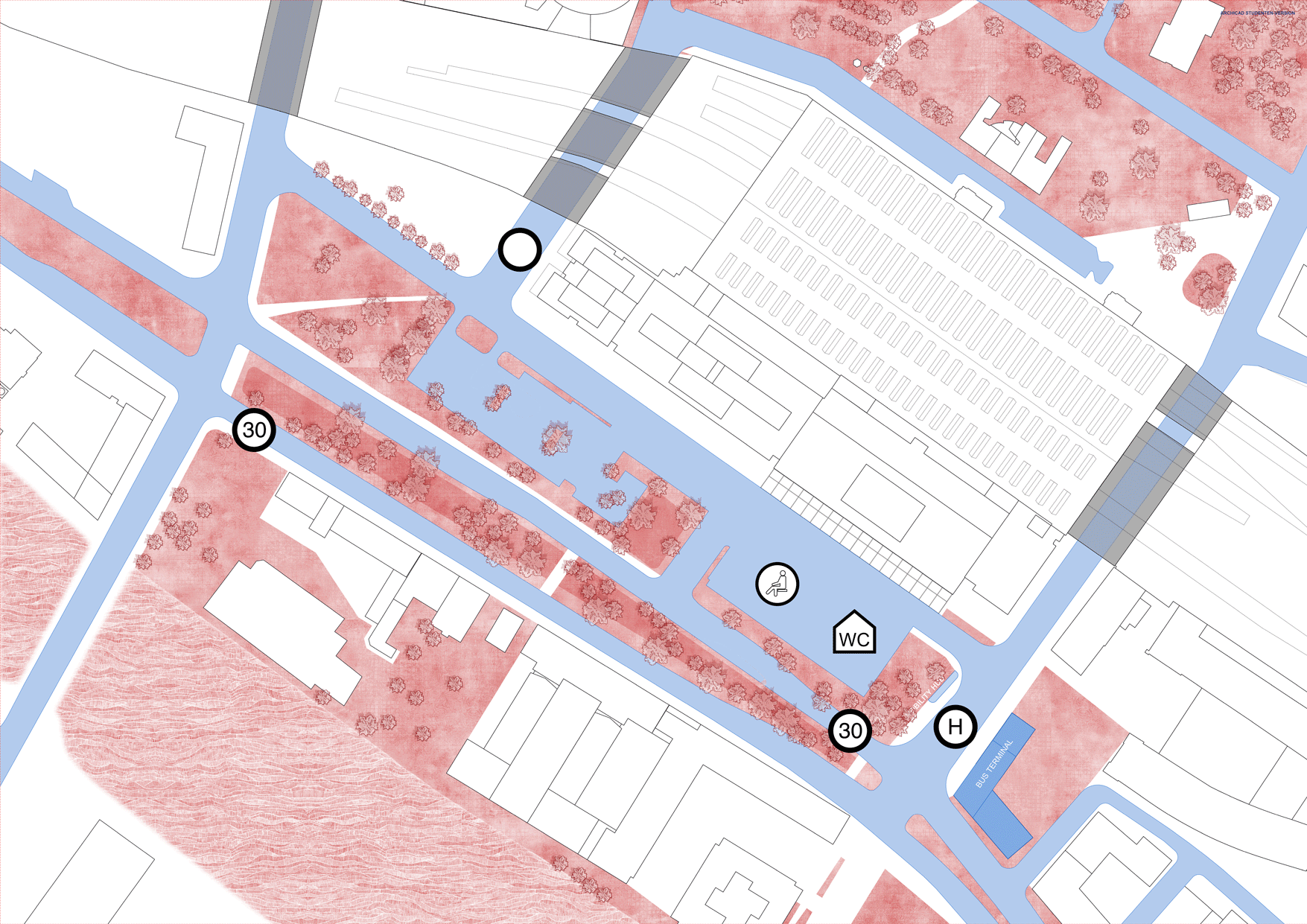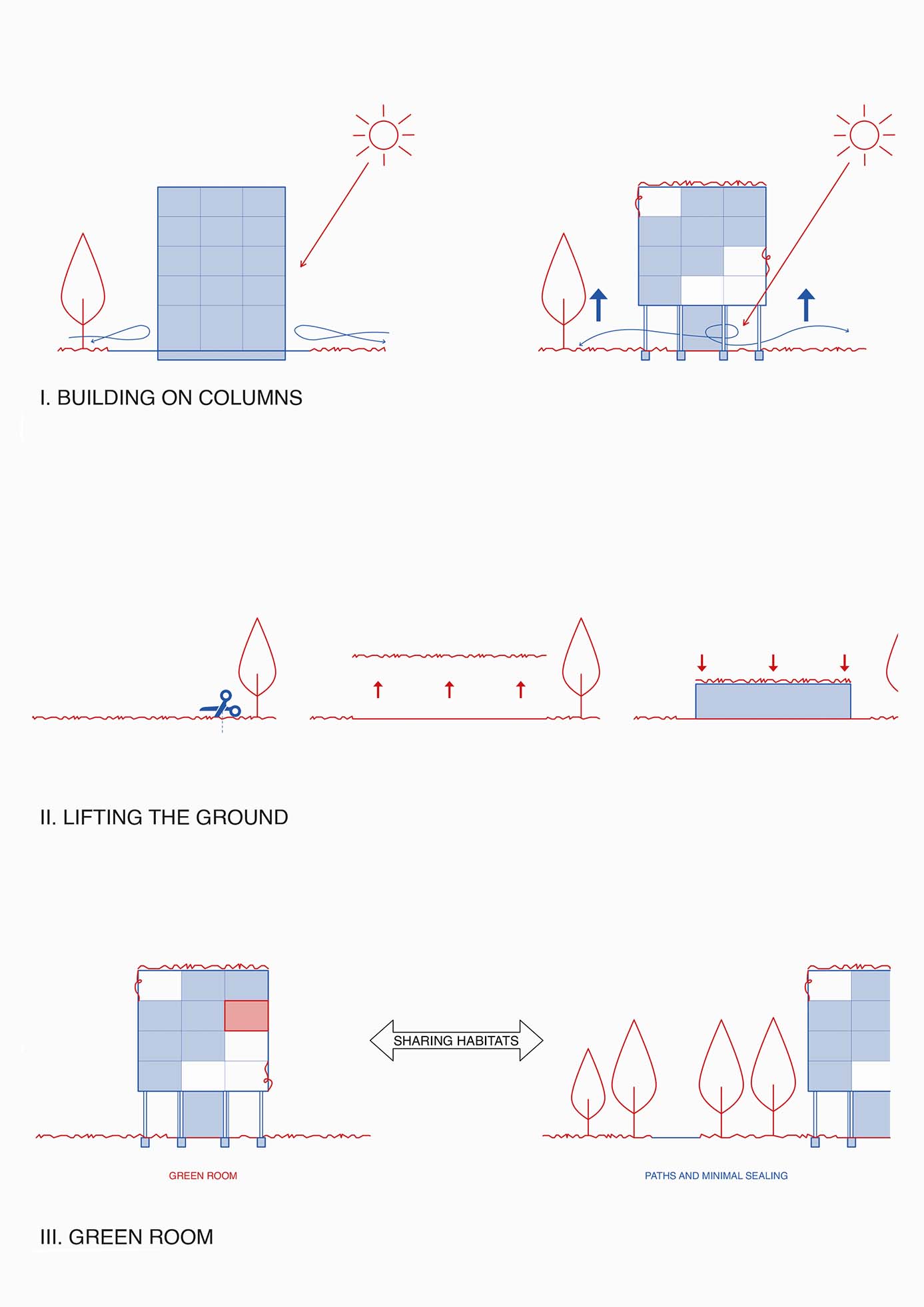 Um den Raum zwischen den menschlichen und nicht-menschlichen Akteuren auszuhandeln, folgt der Entwurf Prinzipien wie eine minimale Versiegelung oder das Grüne Zimmer.