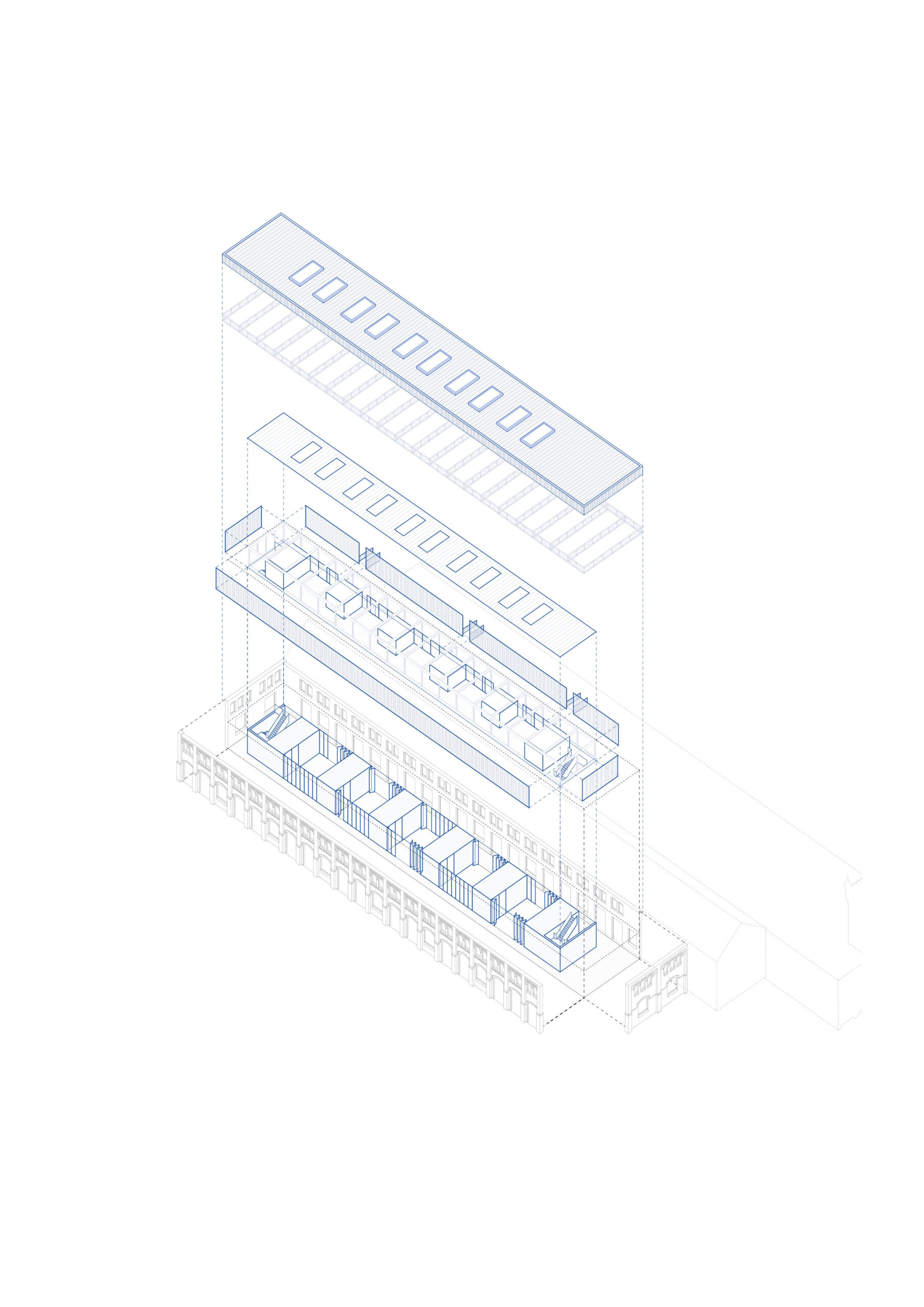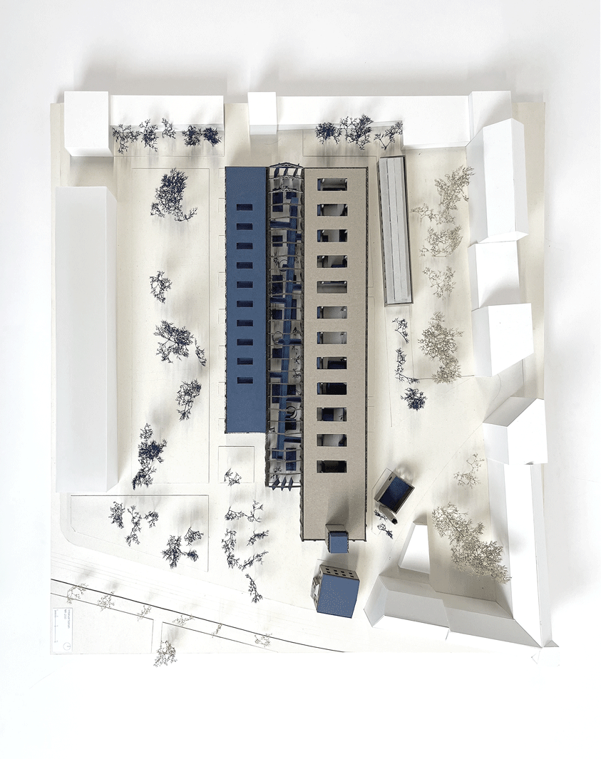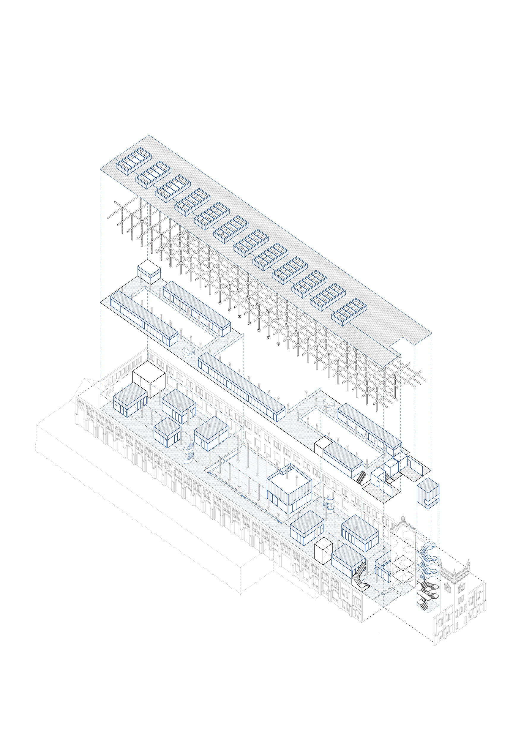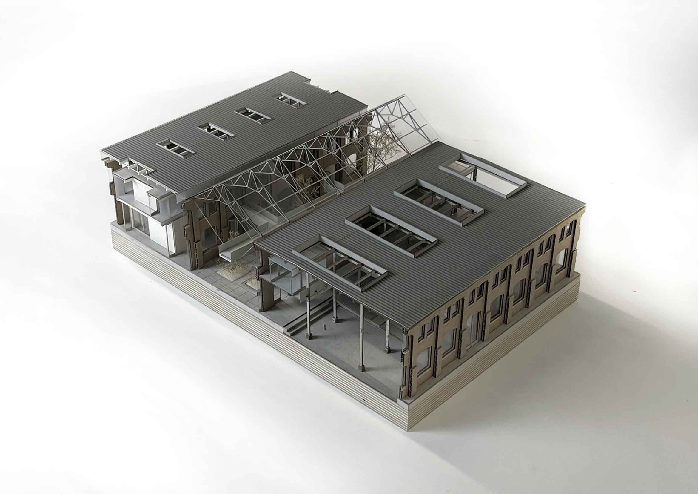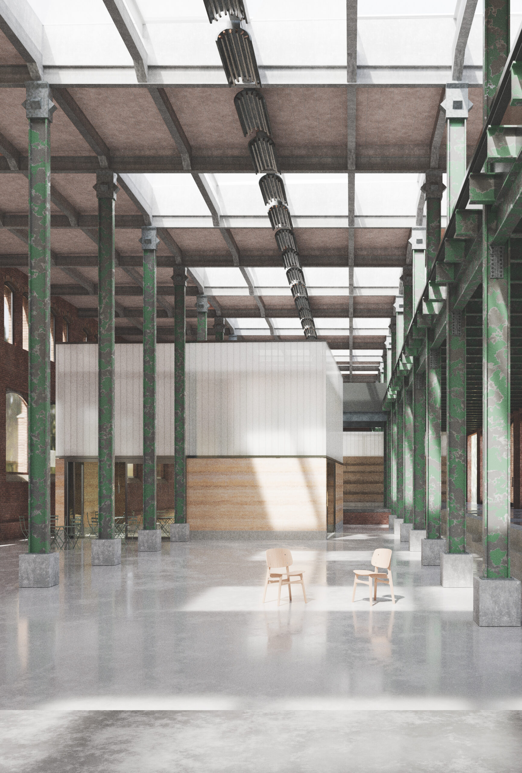 Neue Baukörper, die frei in den Bestandshallen verteilt sind, beherbergen das neue Programm, während die Atmosphäre der Fabrikhallen erhalten bleiben. Die dabei entstehenden Zwischenräume können flexibel bespielt werden und dienen als Erweiterungsflächen der neuen Nutzungen.