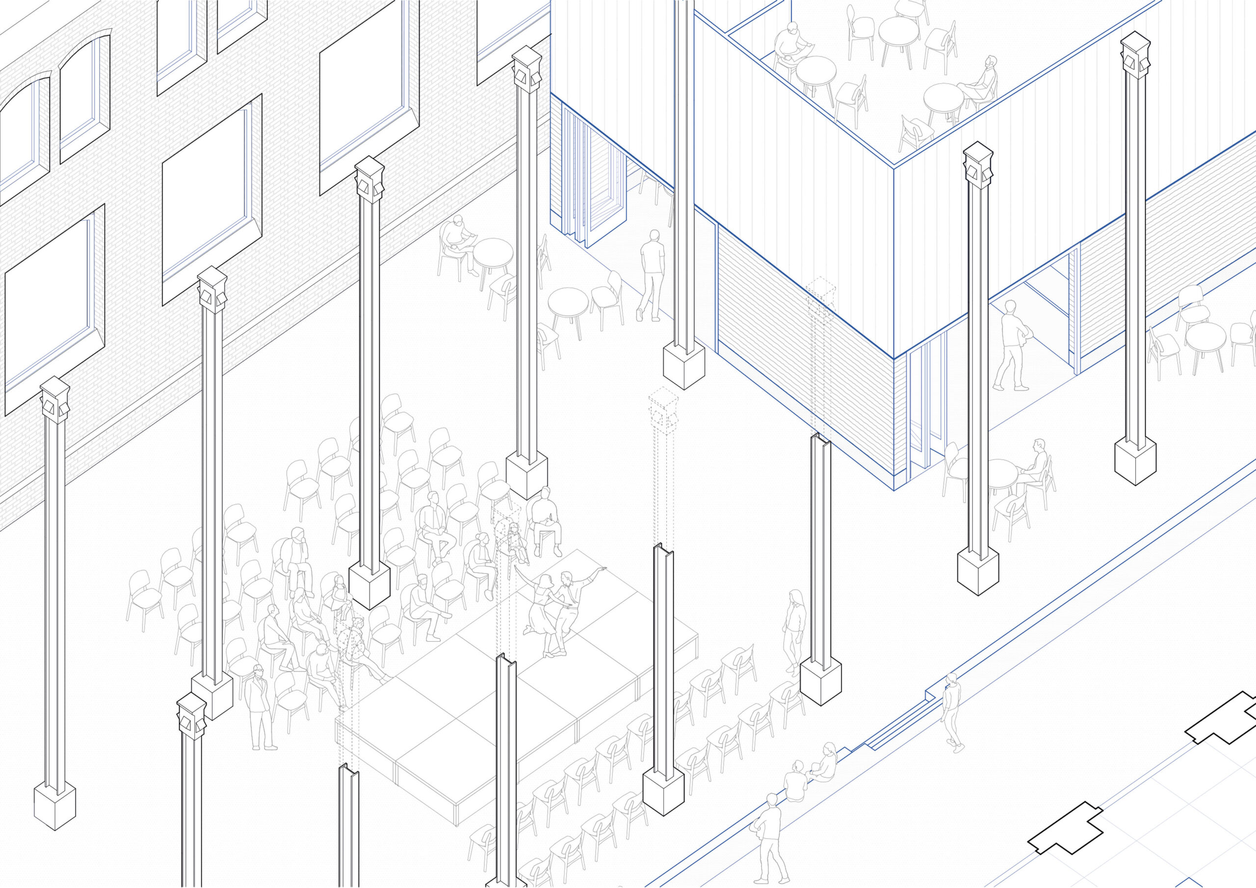 Dabei wird der bestehende Boden herabgesetzt und Teile der Galerie im Norden entfernt, um einen großzügigen Raum zu schaffen, der die komplette Höhe der Halle ausnutzt. Ergänzt wird der Raum durch einen zweigeschossigen Baukörper, der ein Café und Nebenräume enthält. Sitzstufen entlang des Höhenversprungs der Bodenplatte laden zum Verweilen ein.