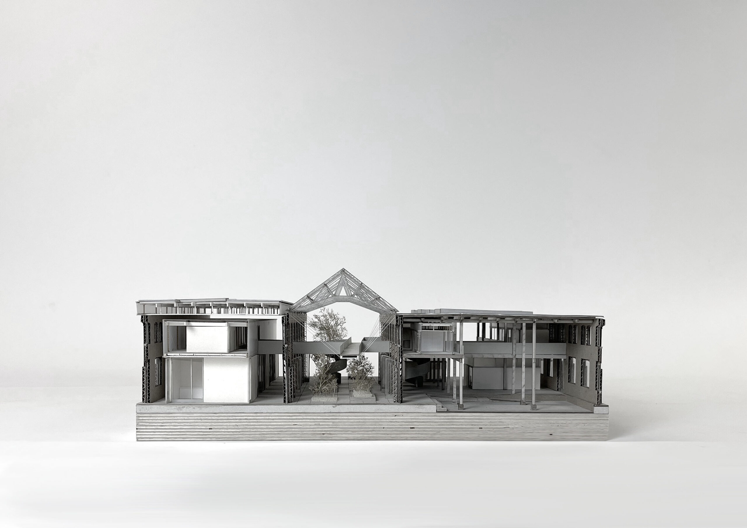 Der überdachte Zwischenhof dient als neuer zentraler Erschließungsraum, welcher die beiden Hallen miteinander verknüpft und einen Ort für informellen Austausch bietet. Durch verschiedene neue Baukörper, die in den Bestandshallen verteilt sind, wird die neue vielseitige Nutzung möglich, während der Charakter und die Atmosphäre der Fabrikhallen erhalten bleiben. Die dabei entstehenden Zwischenräume können flexibel bespielt werden und dienen als Erweiterungsflächen der primären Funktionskörper. Durch eine verspielte Gegenüberstellung von Alt und Neu wird eine Spannung erzeugt, die den historischen Bestand neu in Szene setzt.