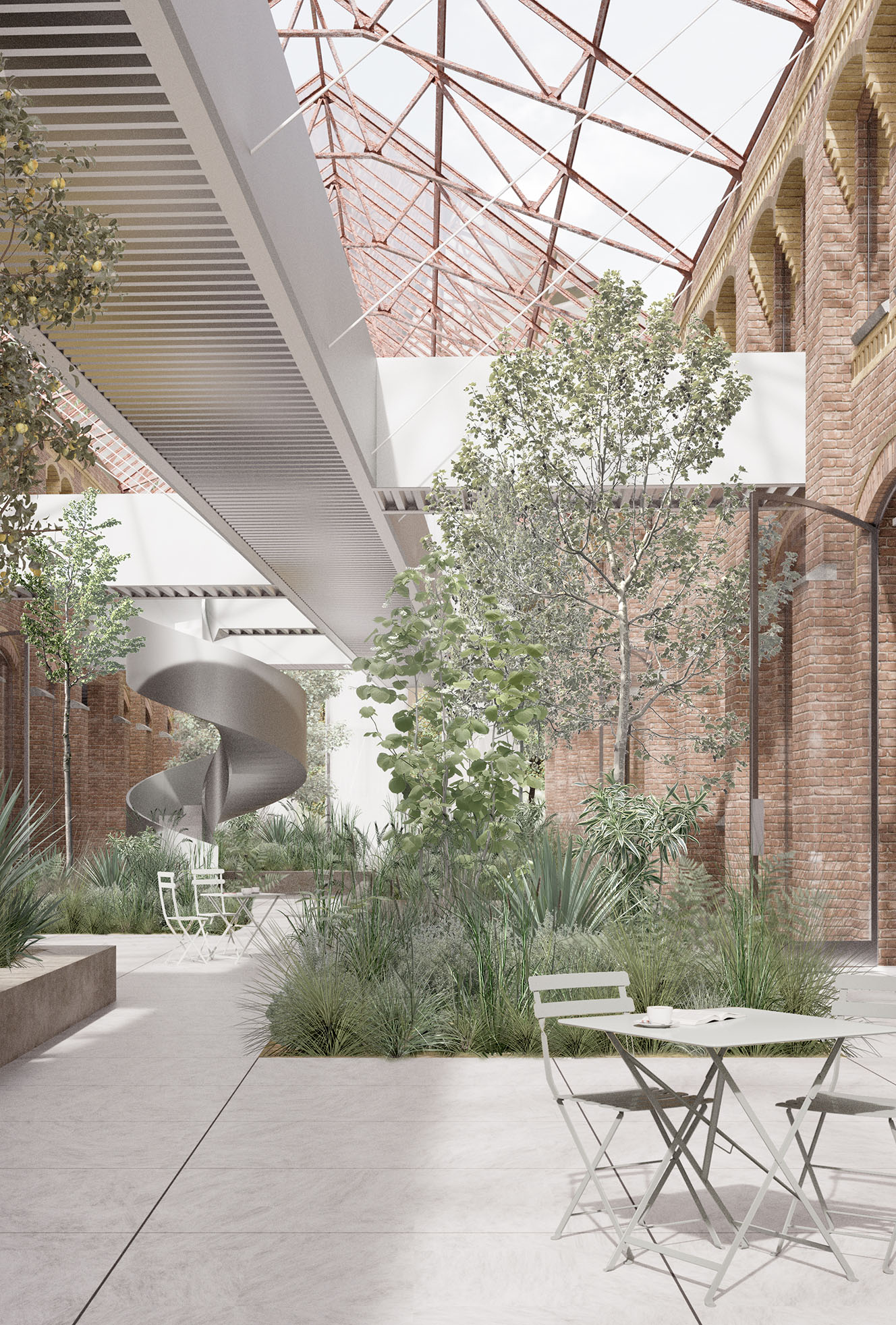 Die Glashalle wird zum zentralen Foyer der Fabrik. Inseln mit intensiver Begrünung gliedern das Erdgeschoss und verstärken das Bild, dass der Raum sowohl als Innen- als auch als Außenraum erscheint. Ein skulpturaler Steg dient als Erschließung und Verbindung der beiden angrenzenden Hallen.
