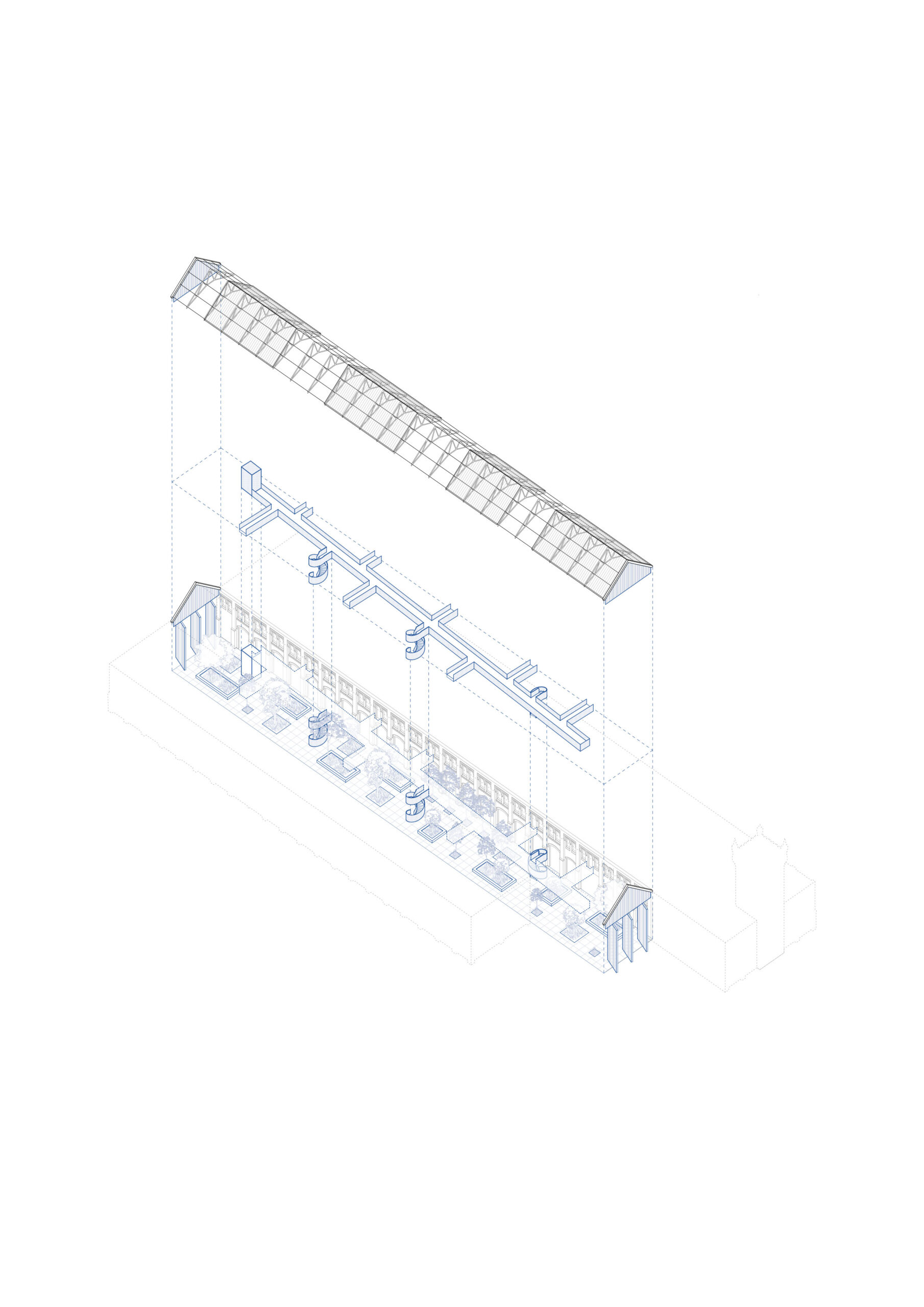 Durch das teilweise Entfernen der bestehenden Verglasung der Überdachung wird die Ambivalenz des Hofs als Innen- und Außenraum zugleich verstärkt, sodass Witterung und Jahreszeiten für die Besucher*innen erlebbar werden.