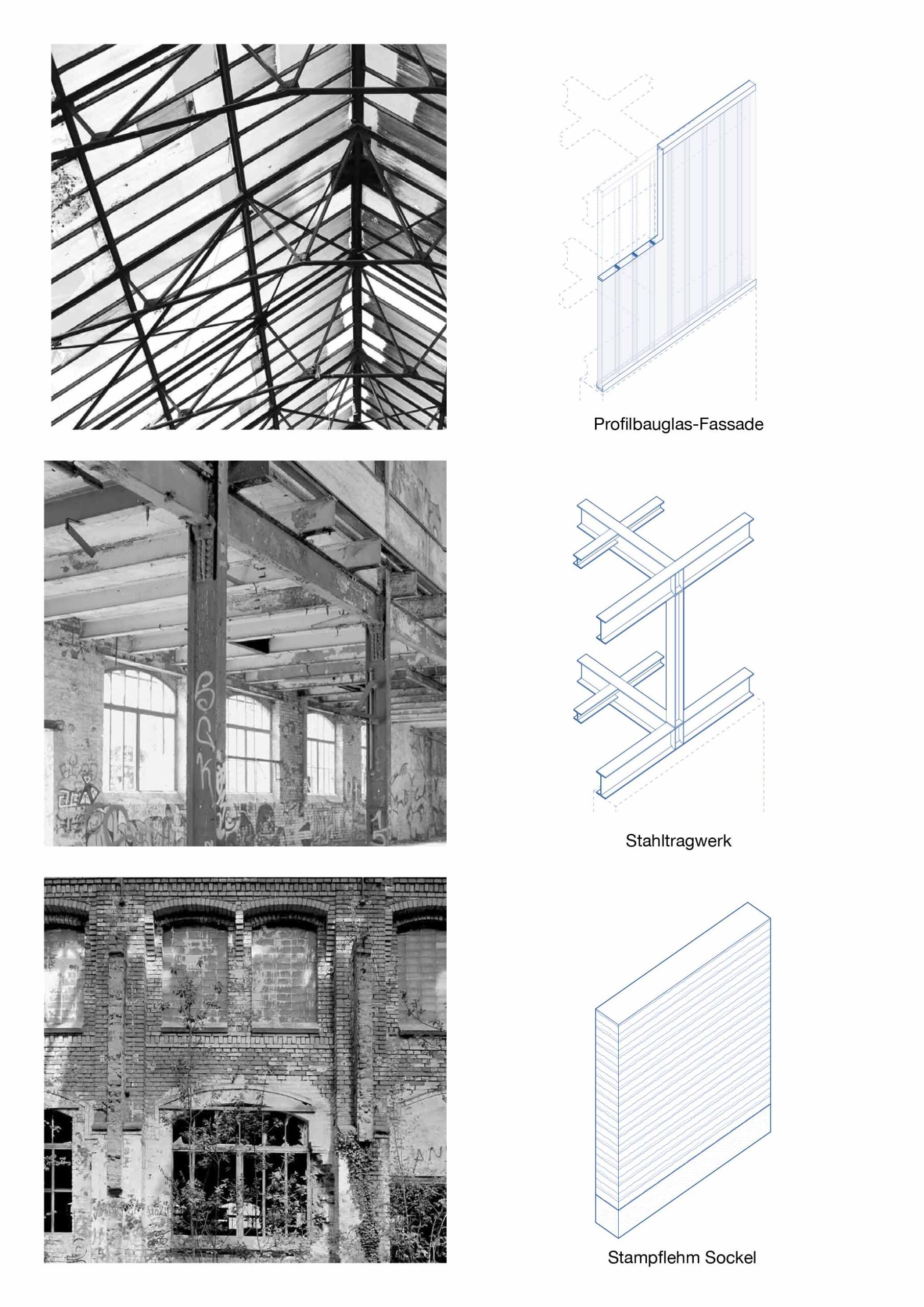 Als übergreifendes Gestaltungsprinzip der neuen Baukörper wird die historische Materialität der Fabrik neu interpretiert. Die Sockel aus massiven Stampflehmwänden, soll an die historischen Ziegelwände erinnern. Ein transluzenter Aufsatz auf den Sockeln setzt sich aus einem Stahltragwerk und einer Profilbauglas-Fassade zusammen. Hier wird das filigranen Bestandstragwerk der Hallen und die historischen Glasbaustein-Trennwändeaufgenommen.