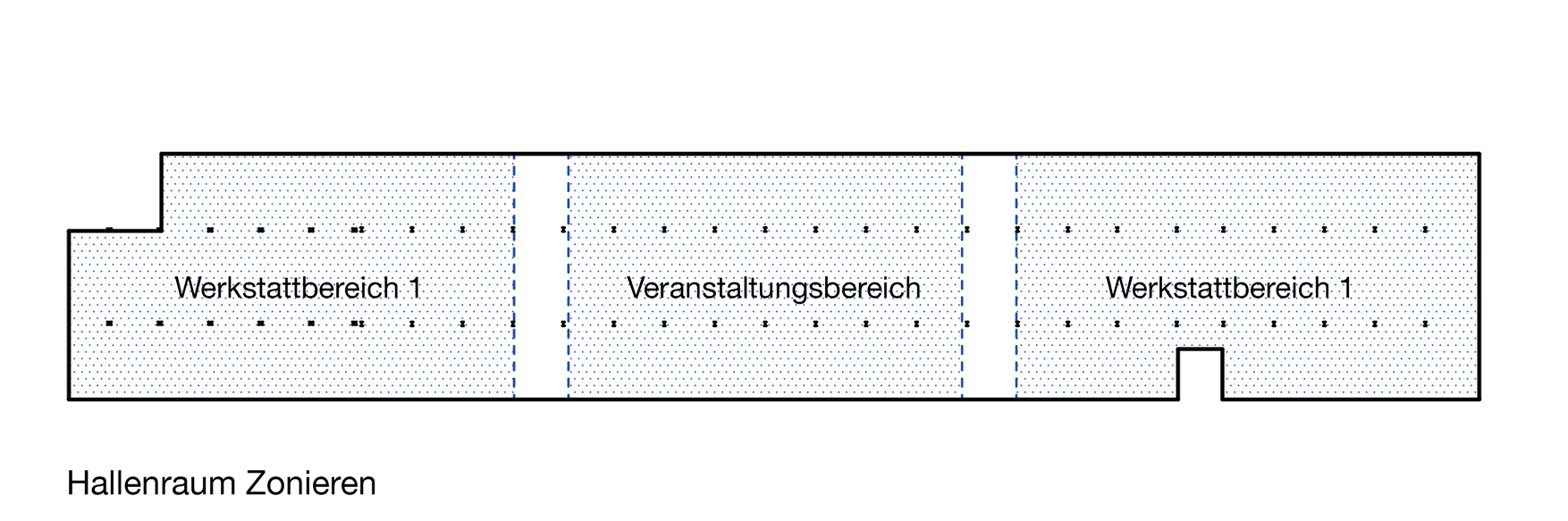 Die Halle A ist geprägt von neuen, frei im Raum positionierten Baukörpern. Diese gliedern die Halle und schaffen kleinere Funktionsbereiche für die Werkstätten. Die verspielte Anordnung soll die freie Nutzung und die Möglichkeit des Ausprobierens verdeutlichen.