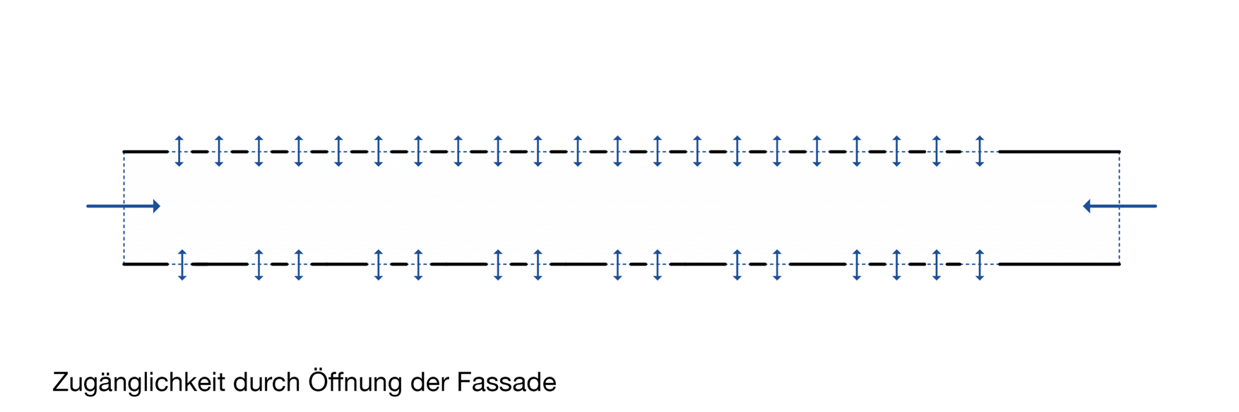 Der neue Baukörper löst sich vollständig von der bestehenden Fassade und erzeugt eine umlaufende Pufferzone, in der sich Neu und Alt gegenüberstehen. Diese dient nicht nur als klimatischer Puffer, sondern kann auch von den Nutzer*innen als erweiterte Ausstellungsfläche und Kommunikationszone genutzt werden.
